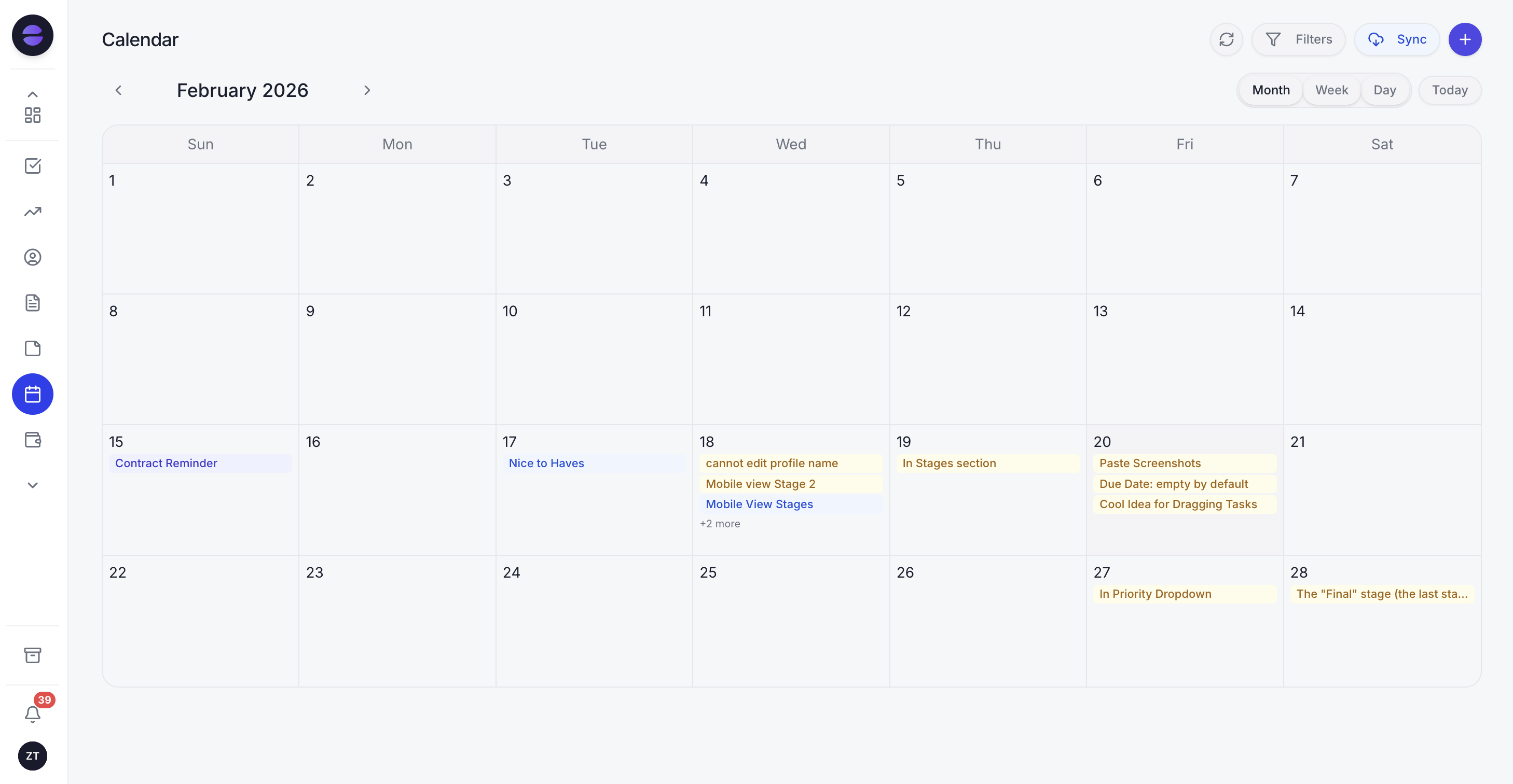 Scheduling and task management live in the same data layer in Zoye, which means your calendar is never out of sync with your project board. Switch between month, week, and day views. Every task with a due date appears automatically. No integration required - it just works.