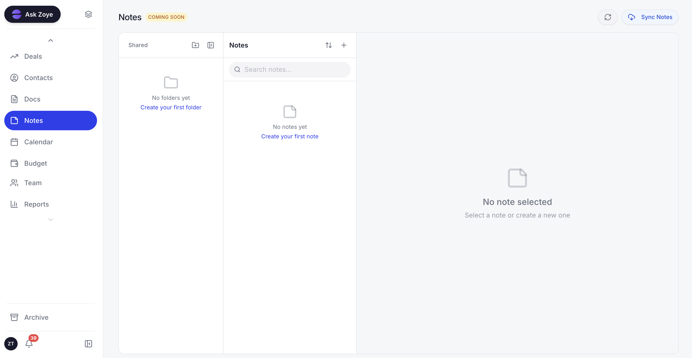 Zoye's Notes module brings shared documentation into the workspace, so you're not paying for a separate Notion subscription to store your SOPs and meeting notes alongside your tasks and CRM.